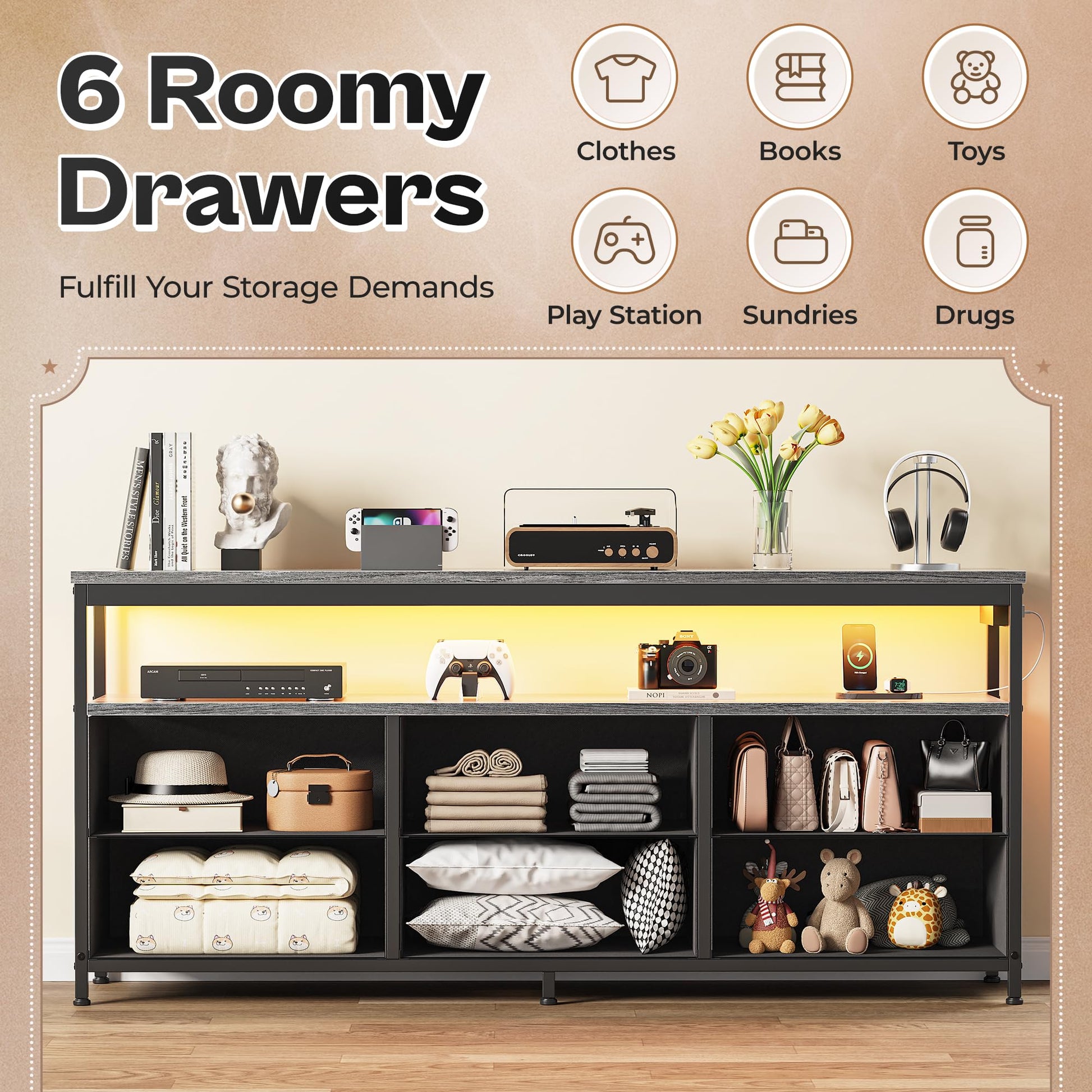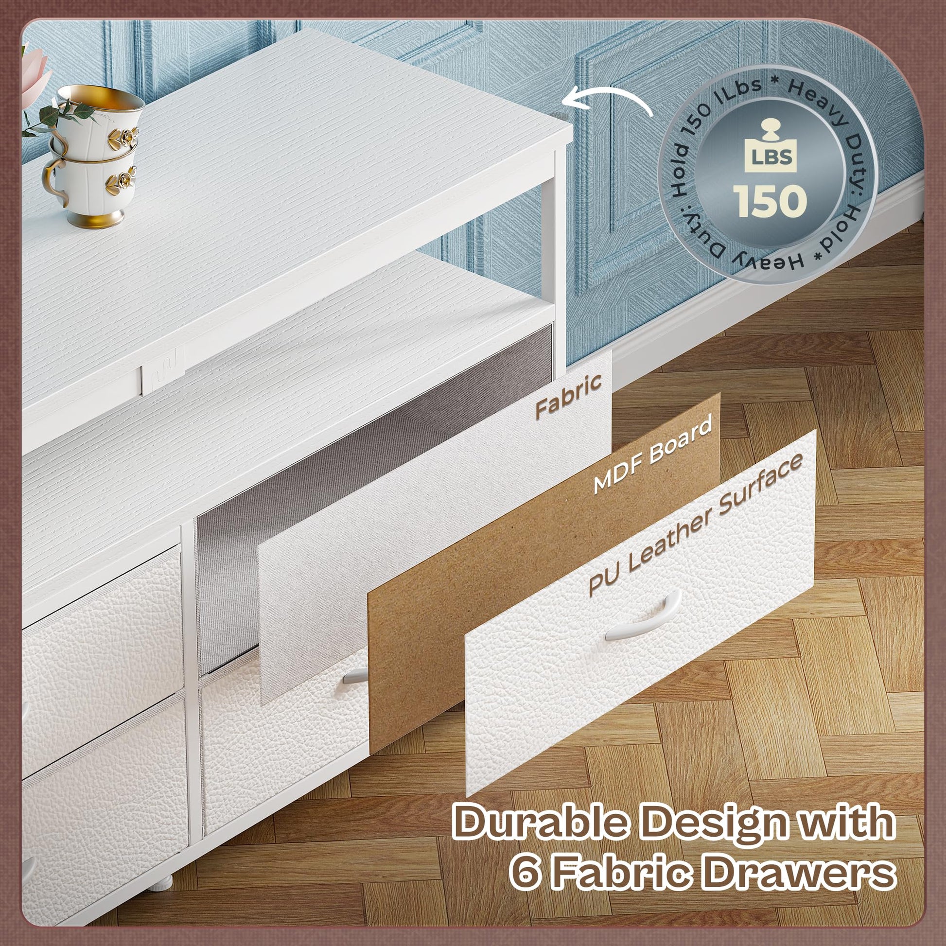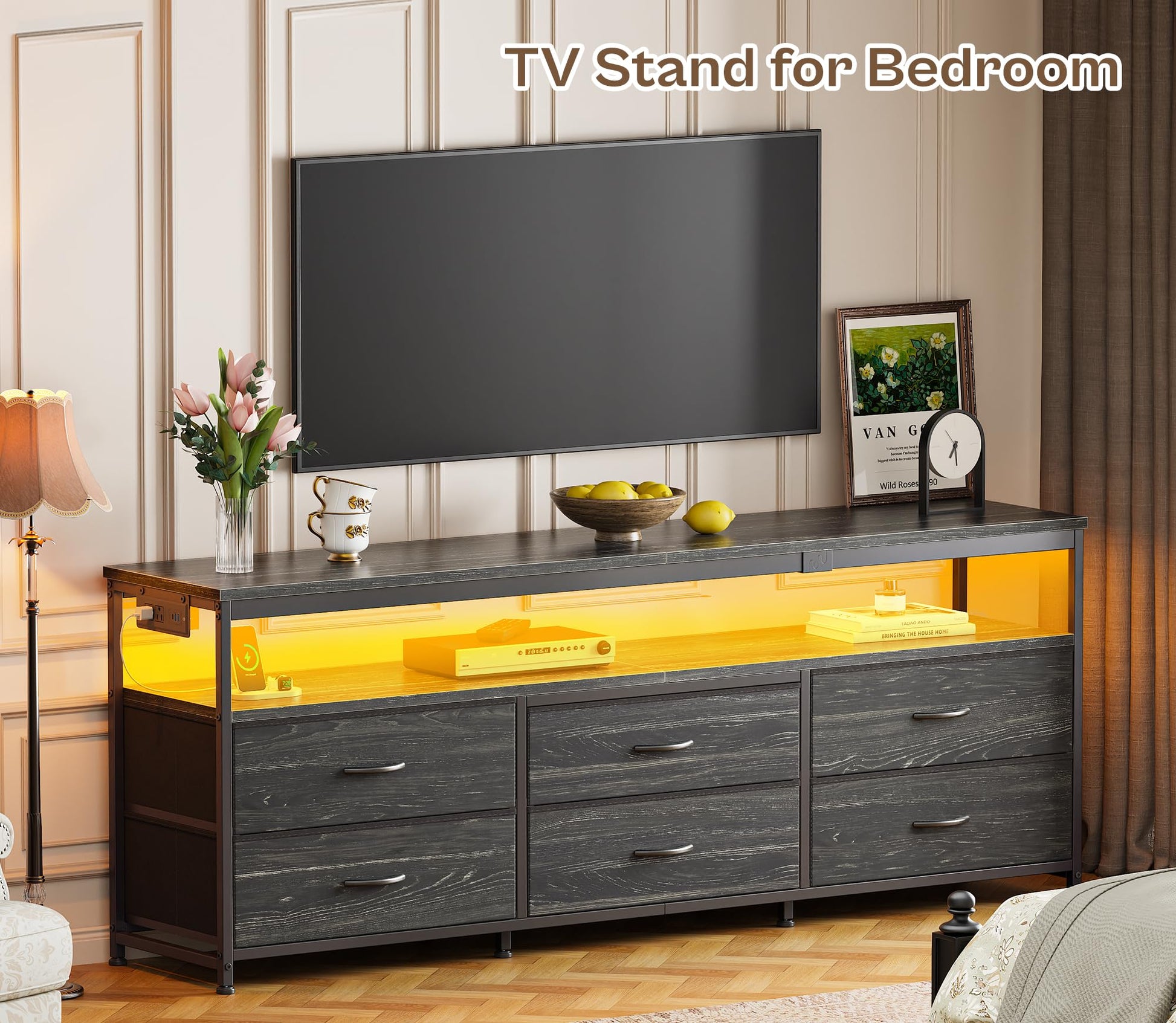 - 【6 Drawer Dresser with Stunning Storage】With 6 large fabric drawers, this low TV stand for bedroom is perfect for storing essentials, from clothes and blankets to books and electronics. The open shelf is ideal for showcasing photos, plants, or decorative items, and spacious desktop can securely support a TV up to 70 inches, creating a tidy, multifunctional space in your home