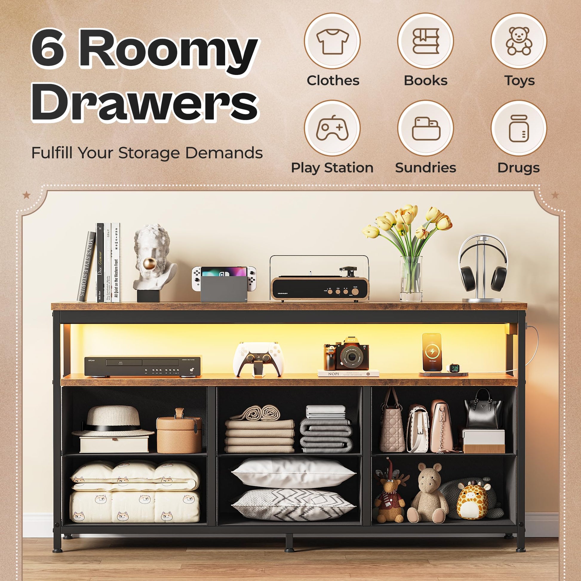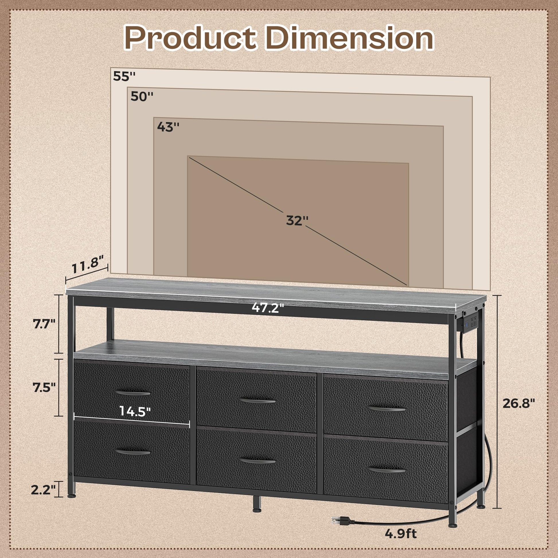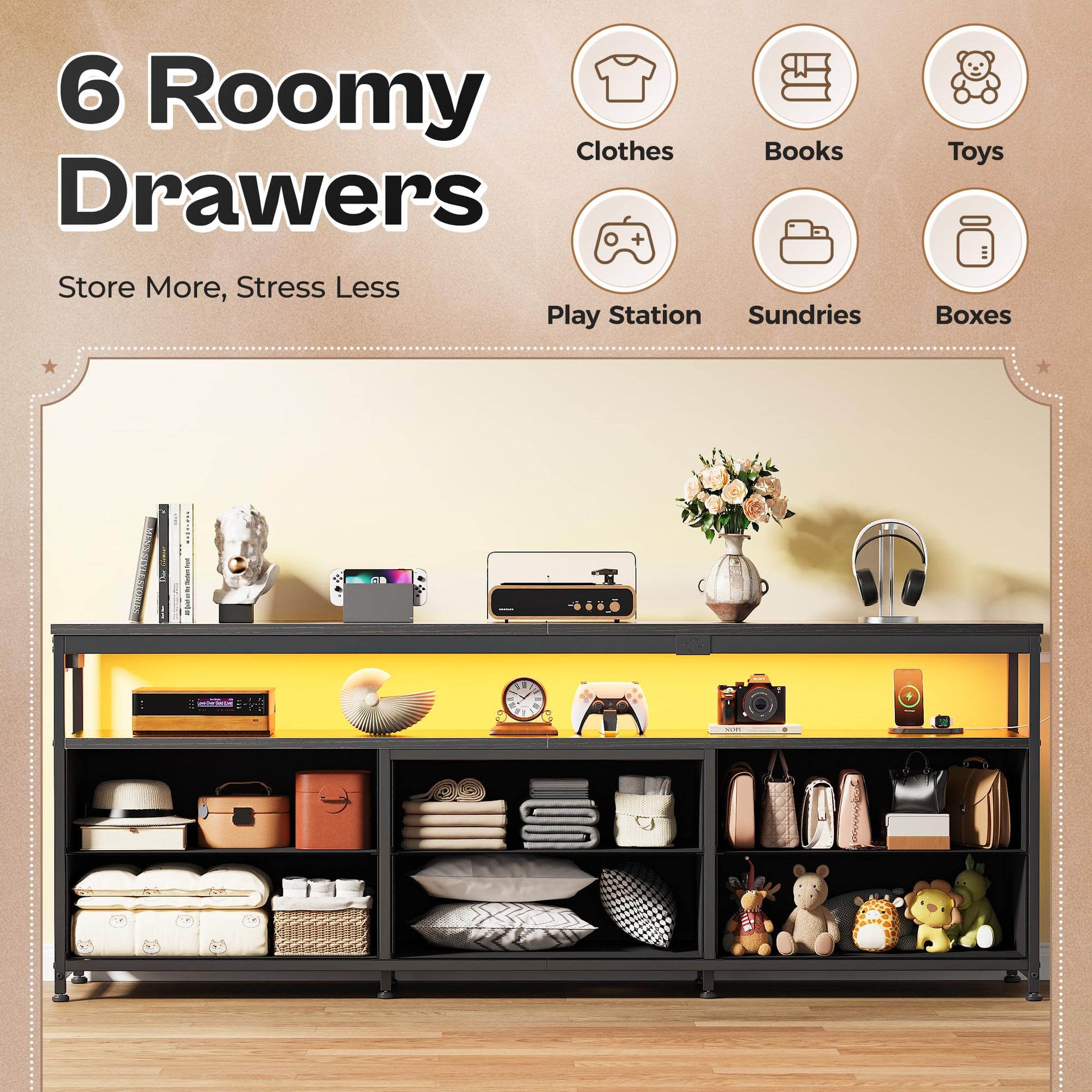 - 【6 Drawer Dresser with Stunning Storage】With 6 large fabric drawers, this low TV stand for bedroom is perfect for storing essentials, from clothes and blankets to books and electronics. The open shelf is ideal for showcasing photos, plants, or decorative items, and spacious desktop can securely support a TV up to 70 inches, creating a tidy, multifunctional space in your home