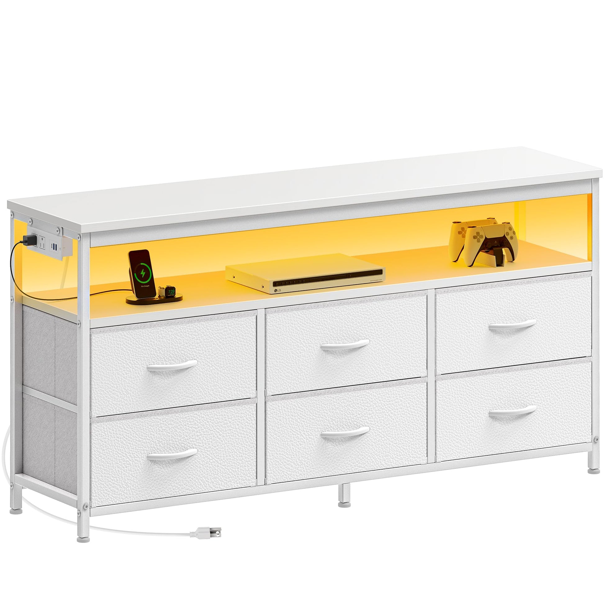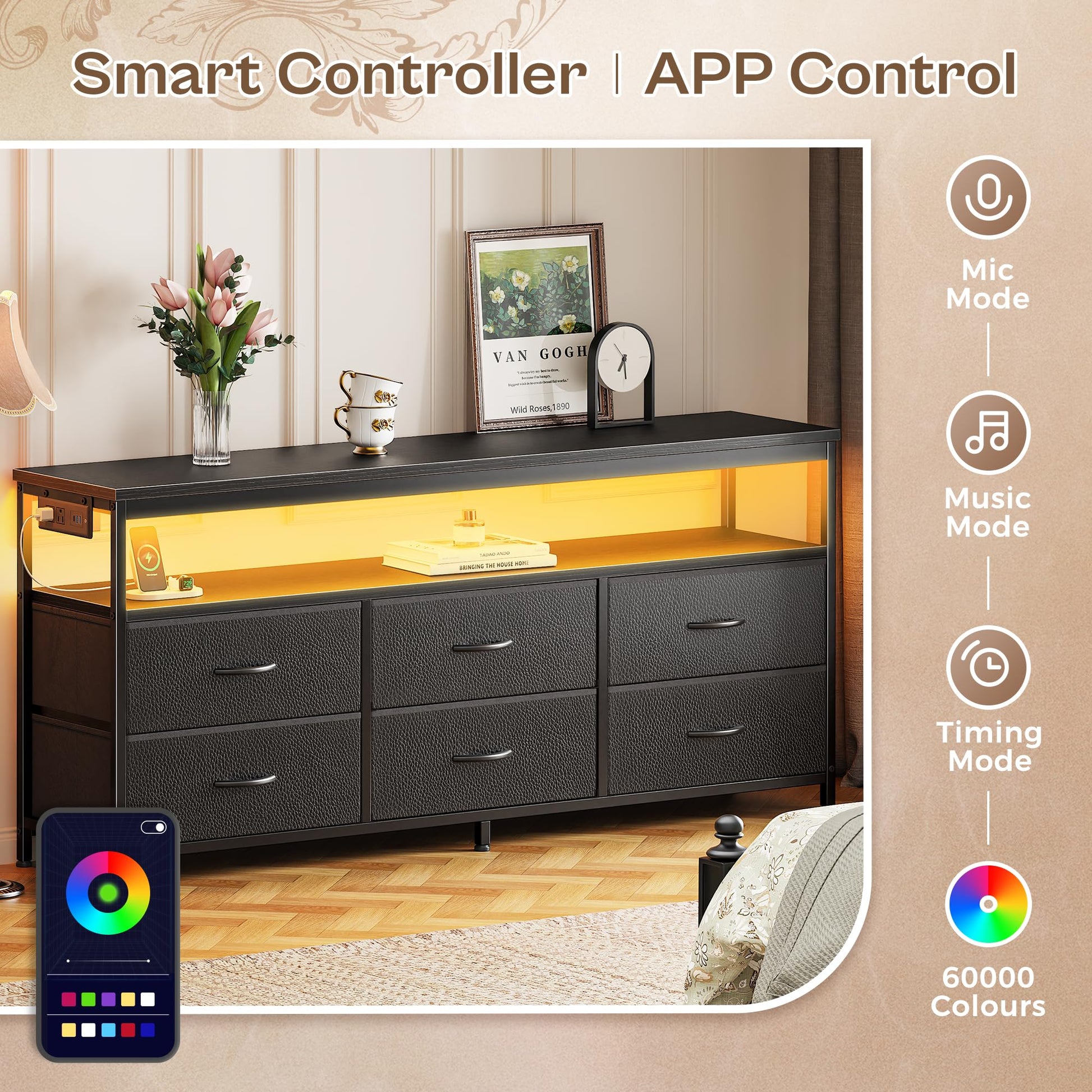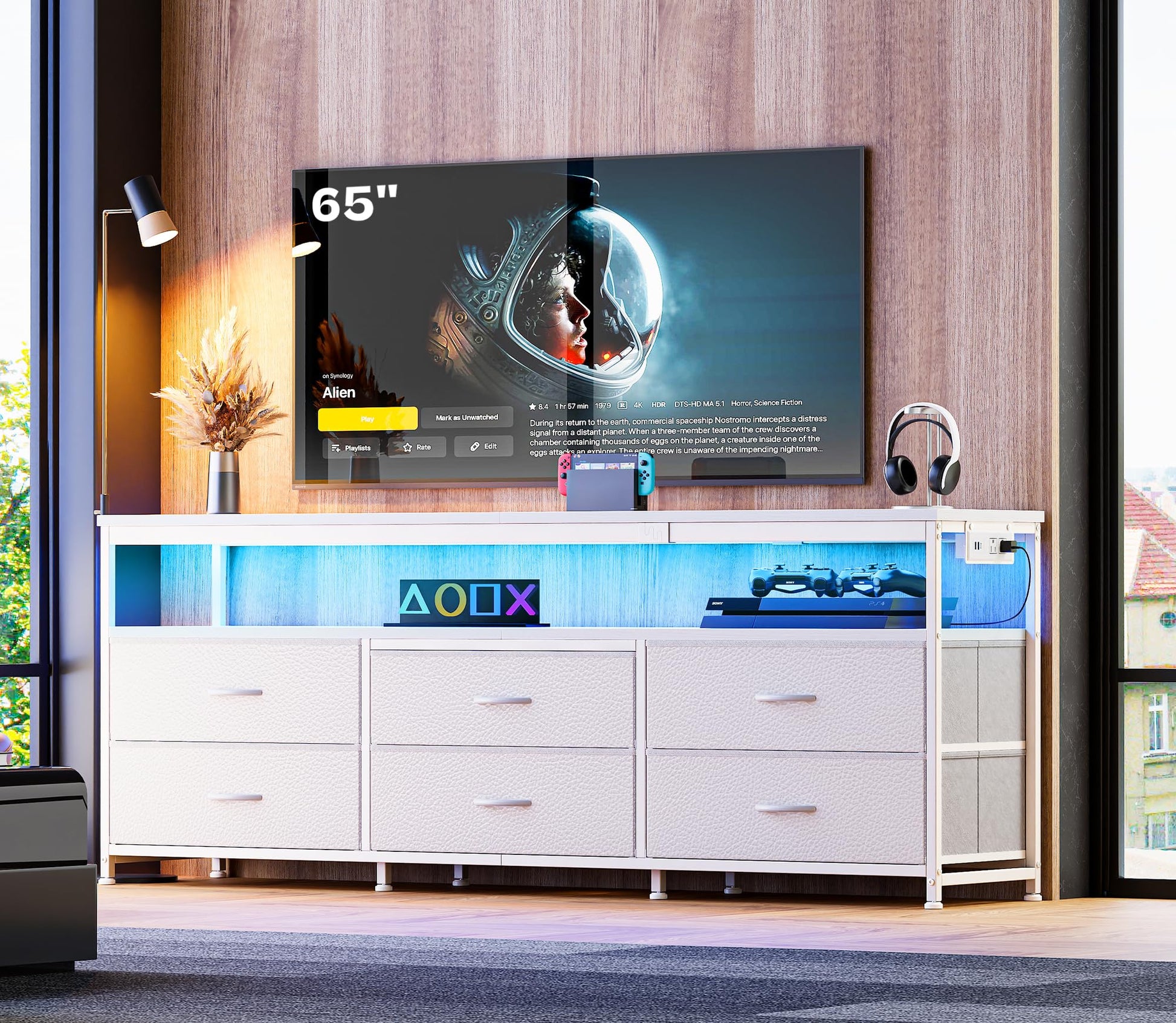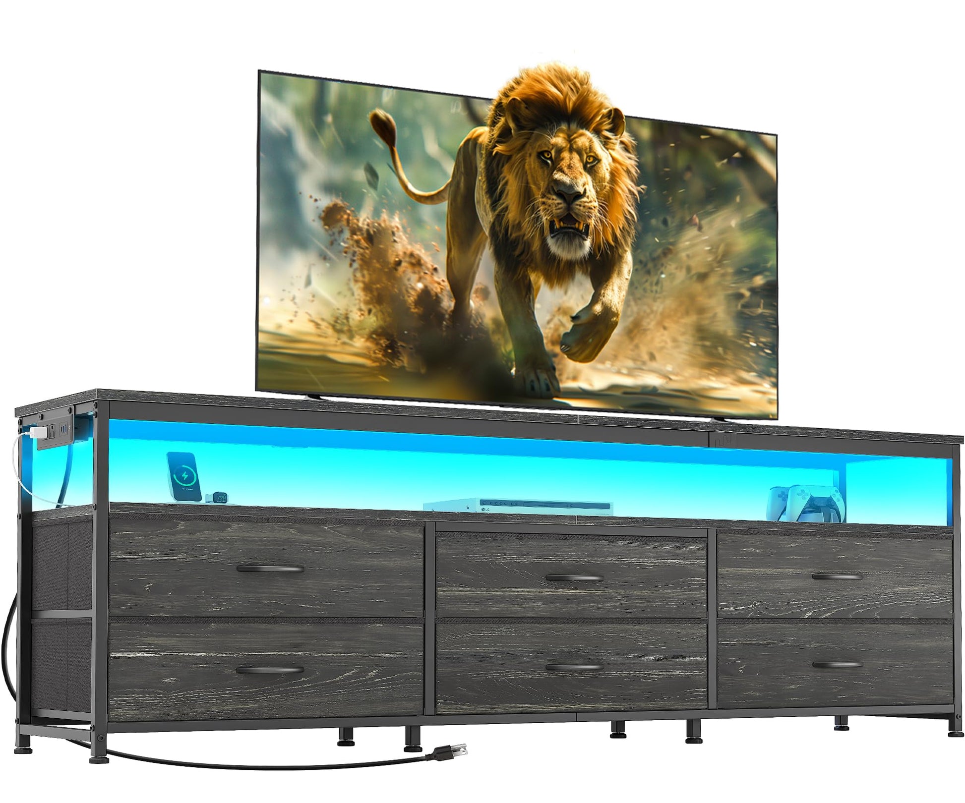 - 【Power Outlets & LED Lights】Equipped with 2 AC outlets, 2 USB ports and 1 Type-c port, this TV stand with storage offers convenient charging for your TV, gaming equipment, and other electrical devices. Use LED lights on the fabric dresser to add watching vibes via smart controller or use the app to explore over 60,000 colors, timing mode, mic mode, and music mode. What's more, you have the option to install these outlets on either the left or the right side, whichever suits your usage better and maximizes your convenience