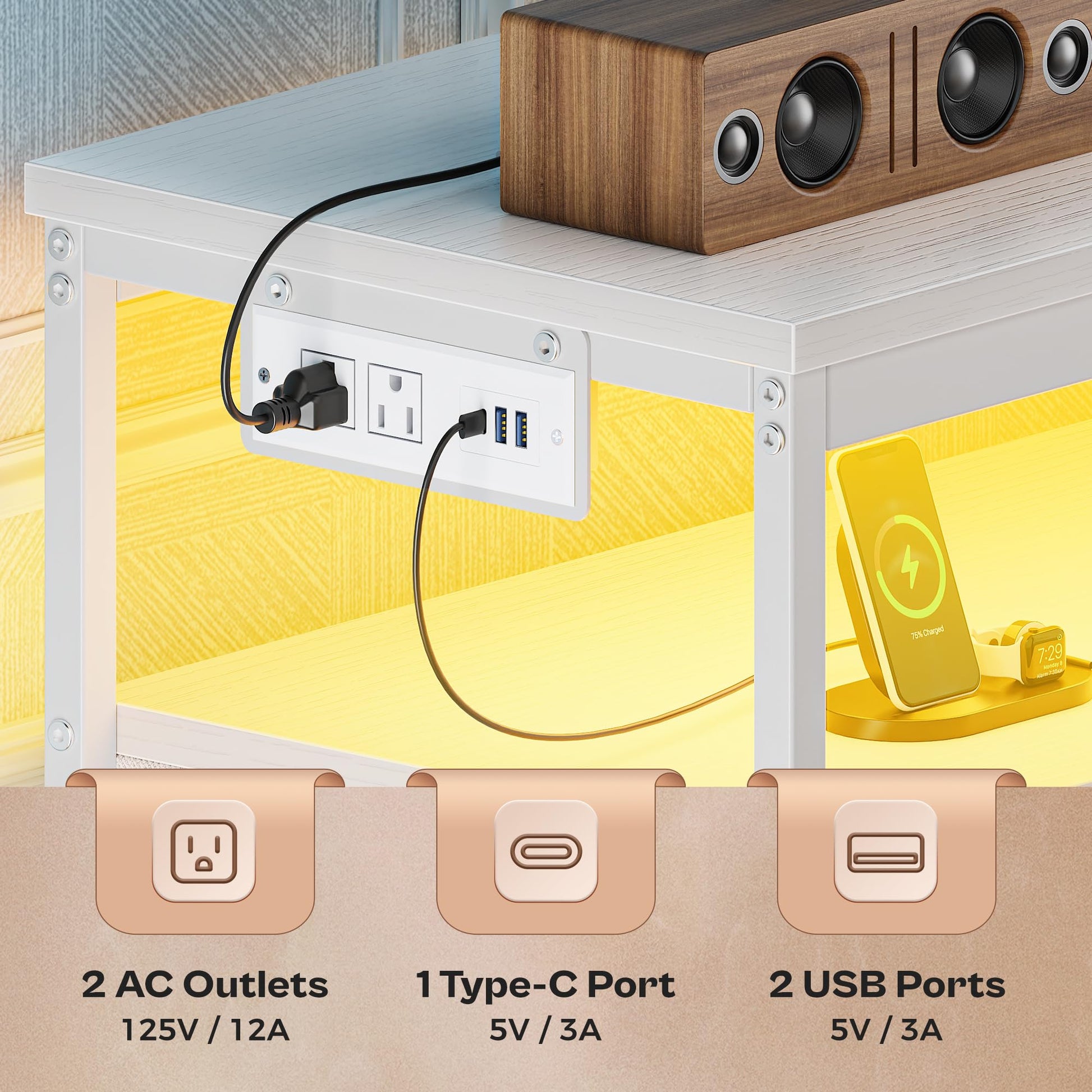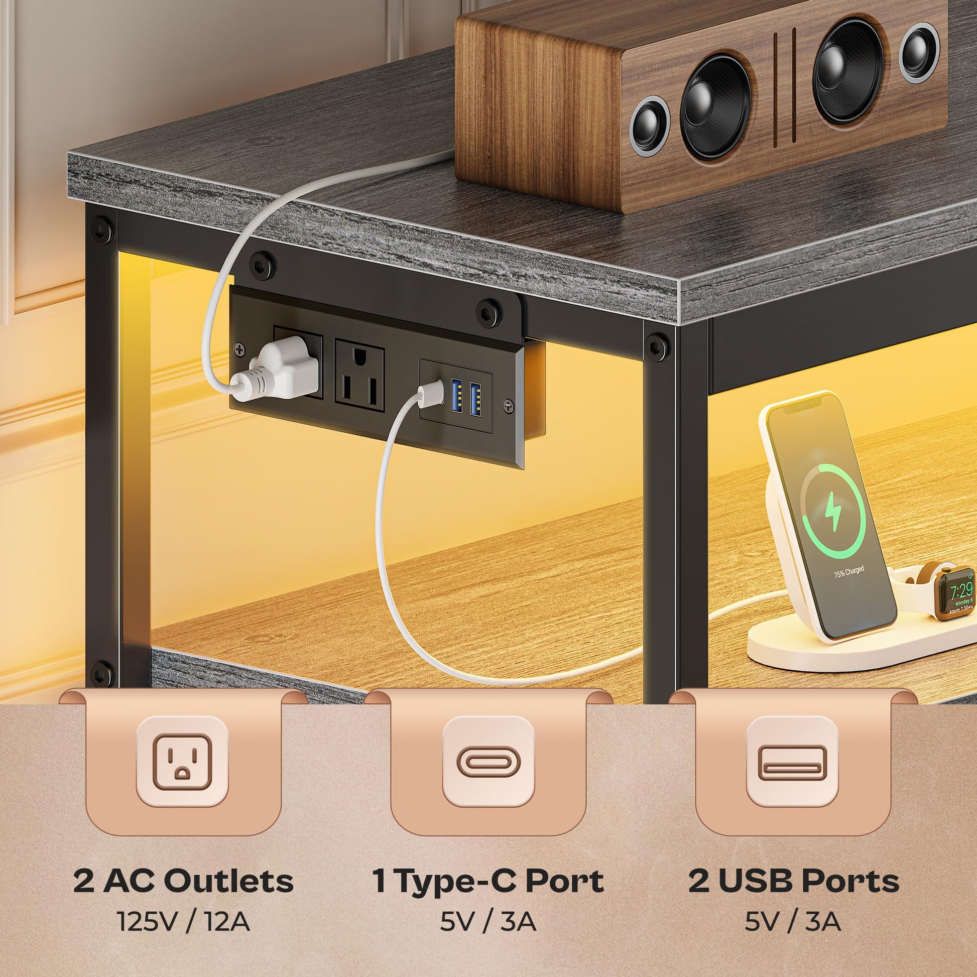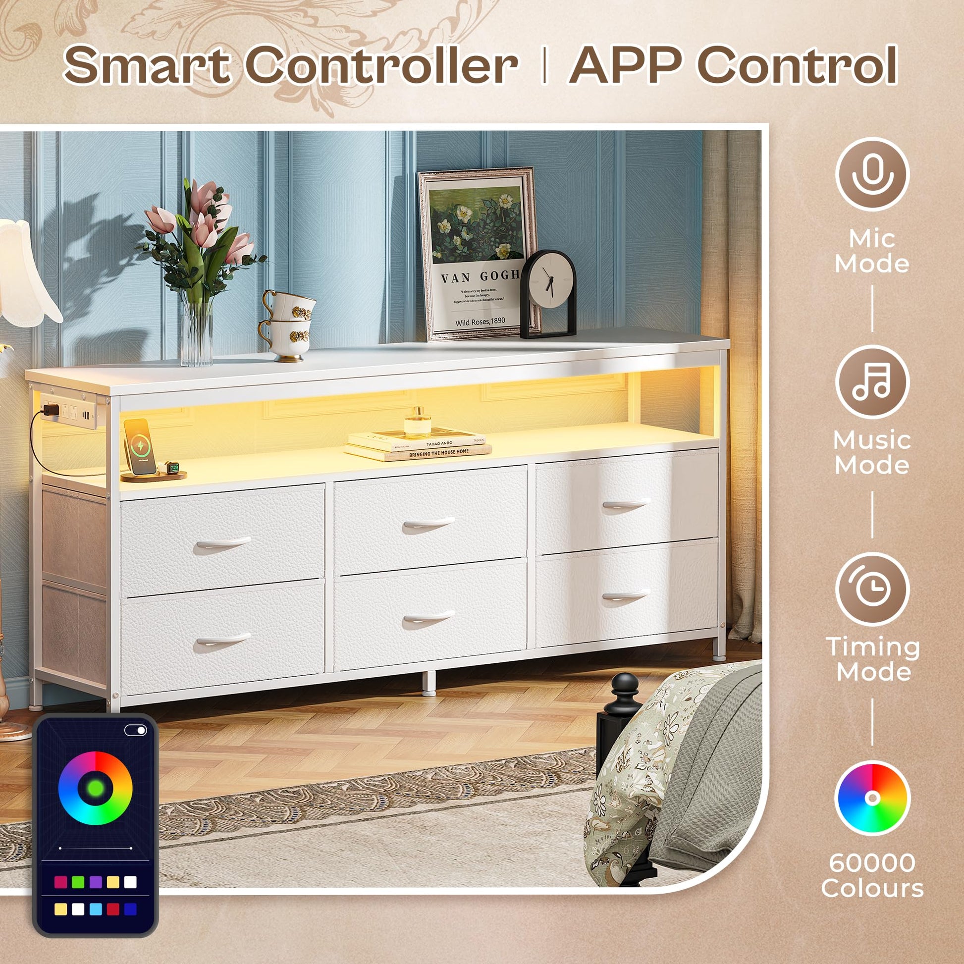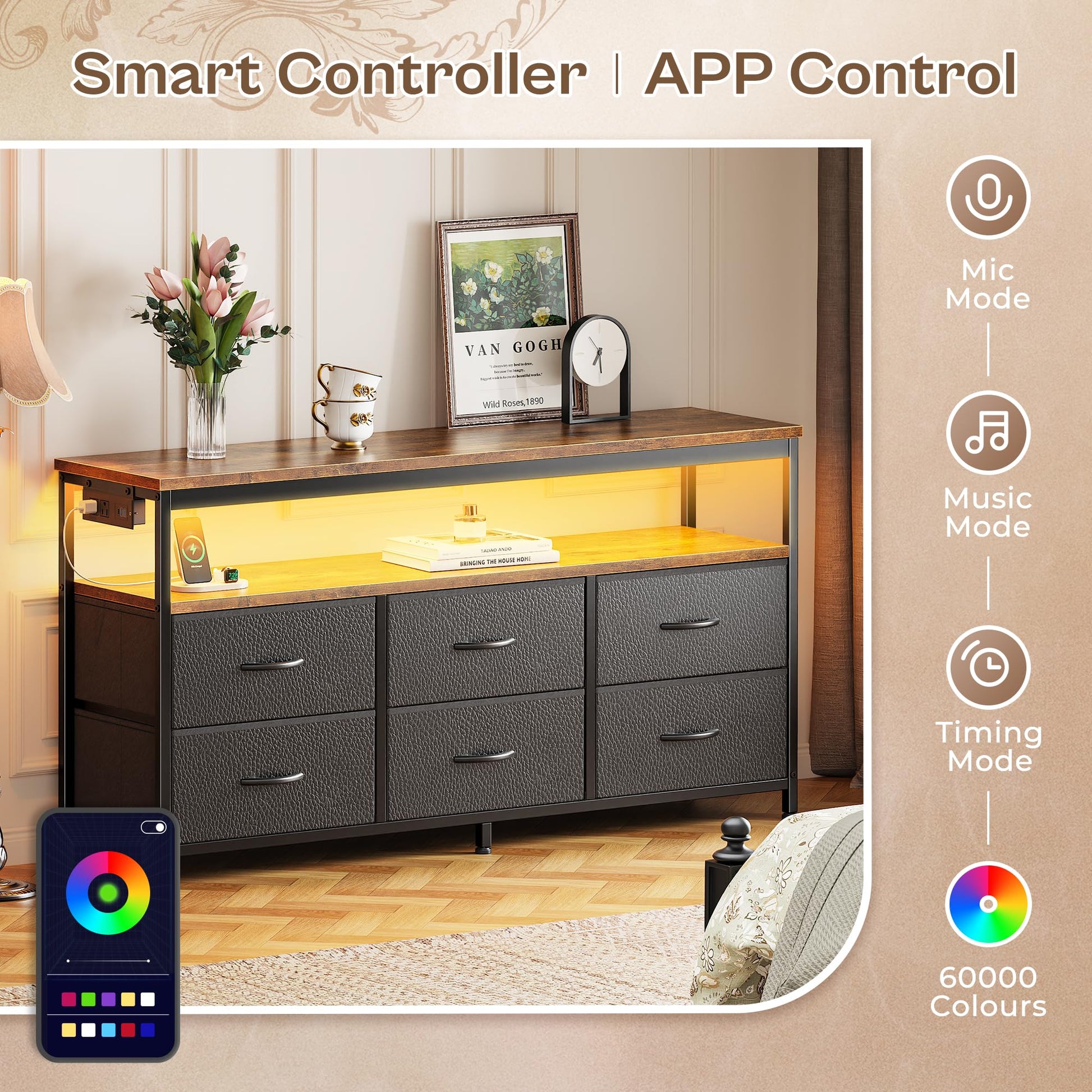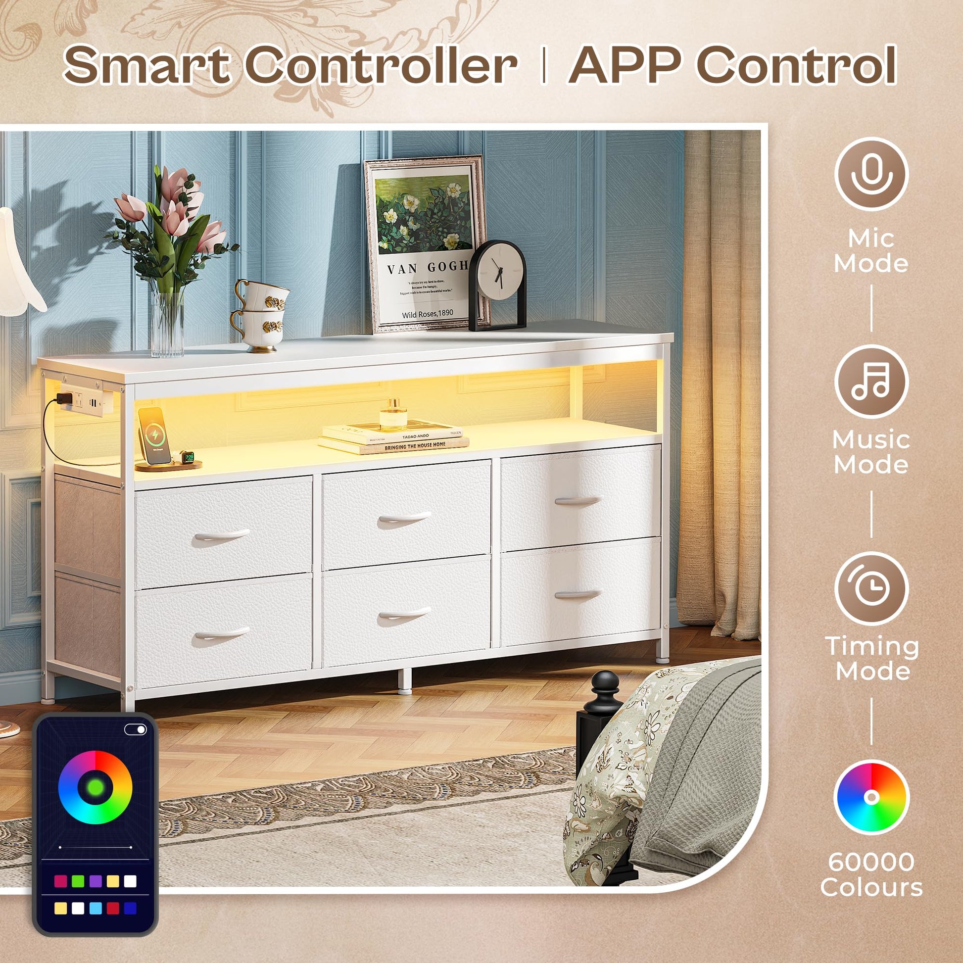 - 【Power Outlets & LED Lights】Equipped with 2 AC outlets, 2 USB ports and 1 Type-c port, this TV stand with storage offers convenient charging for your TV, gaming equipment, and other electrical devices. Use LED lights on the fabric dresser to add watching vibes via smart controller or use the app to explore over 60,000 colors, timing mode, mic mode, and music mode. What's more, you have the option to install these outlets on either the left or the right side, whichever suits your usage better and maximizes your convenience