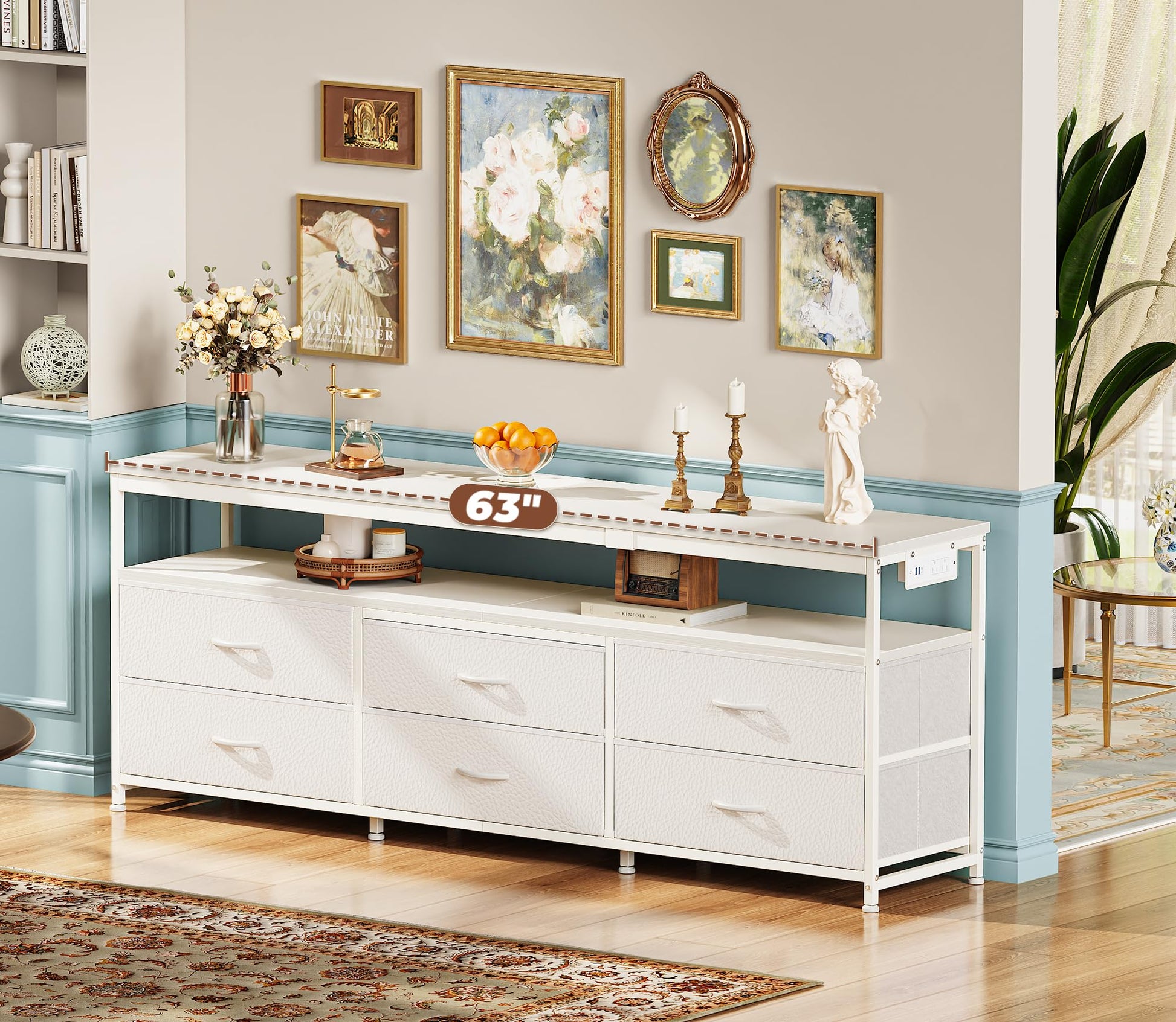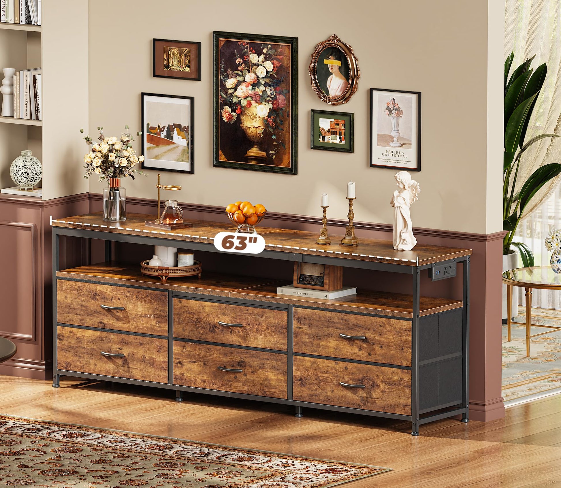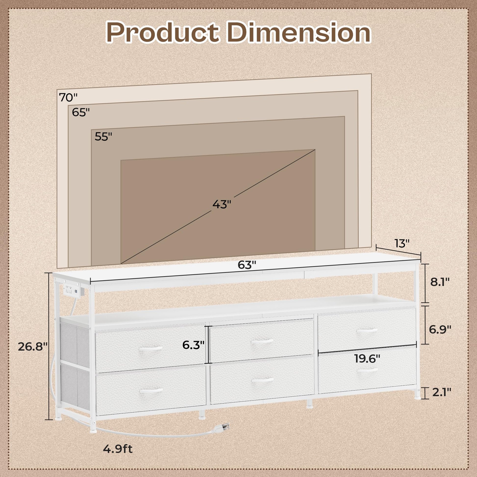 - 【Long TV Stand for 70 Inch TV】Looking for a wider and larger TV stand dresser to enhance your binge-watching or gaming experience? This 63" long desktop design offers plenty of space for big screens, fitting 55", 60", 65", or even 70" TVs with ease. Perfect for creating the ultimate viewing setup in your living room or game room!