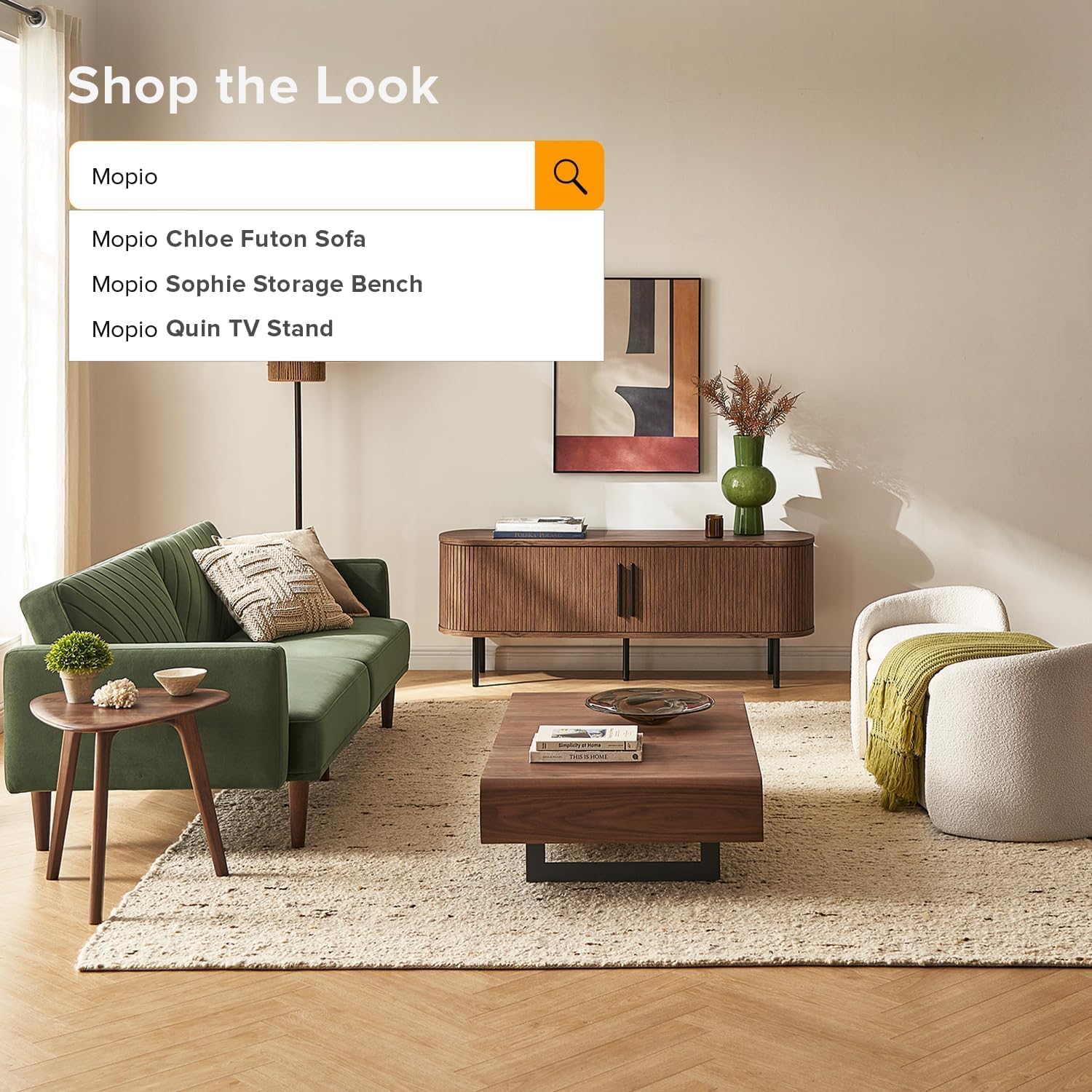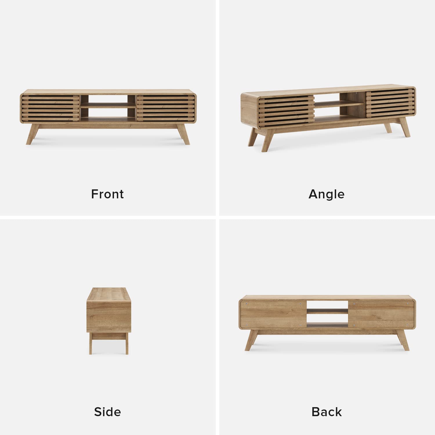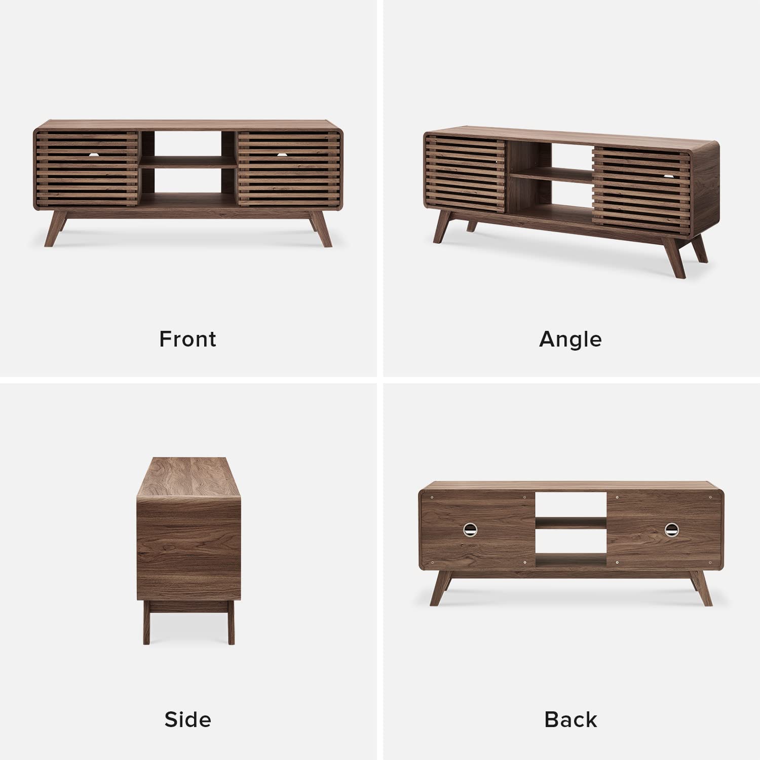 - Design: Mid-century modern TV stand with slatted door design and adjustable shelves. Multiple storage spaces for your consoles